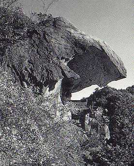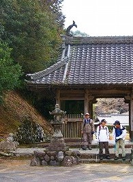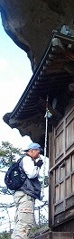 ![]() 岩屋本堂からの御笠岩(岩屋本堂の天井の上に出る) は止めなさいと注意され出発(薬師堂をバックに) |