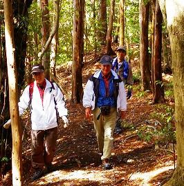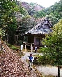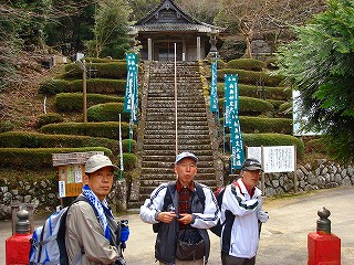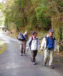 ![]() にこやかにストックも突いて薬師堂にお参りをして、行場に向かう。 |