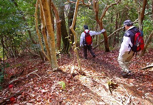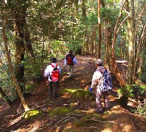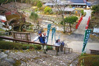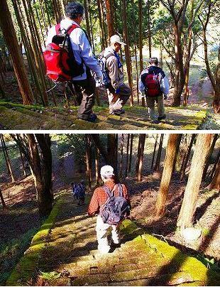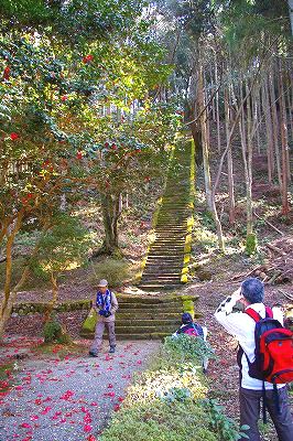 ![]() 4人の修験者は「落ち椿」に迎えられて苔むした階段を無事下山 |