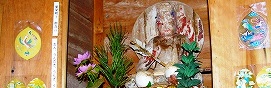 ![]() 天井付きのちょっとした空間があり、そこに祠が建てられていた。 中には前鬼・後鬼を従えた役行者小角(えんのぎょうじゃおづぬ)が祀られている。 |