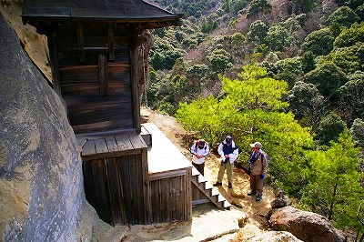 ![]() 左)覆いかぶさった巨岩を見上げる 中)岩屋本堂に安全祈願 右)「東のぞき」は足がすくむ |