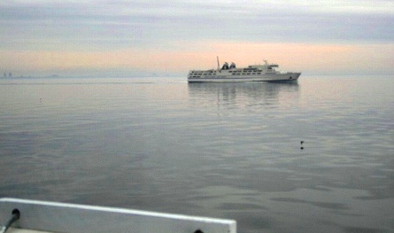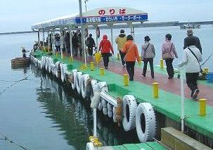 ![]() 加茂湖のカキの養殖イカダを見ながら両津港へ |
