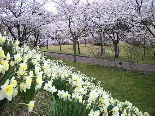 ![]() 昼食会場に近い真野公園は綺麗な水仙・桜が満開 |
