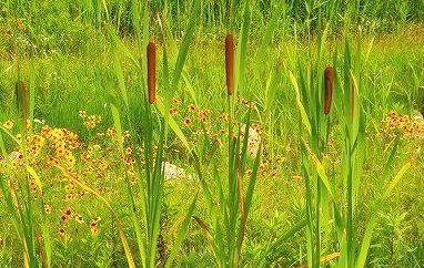 ![]() ガマの穂に似た色のガマガエルがいるが、名前は関係あるのかな? ガマの穂が立ち並ぶ |