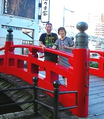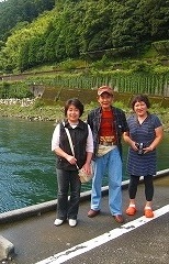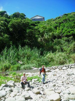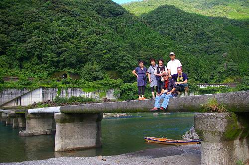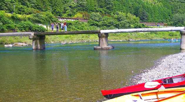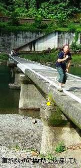 ![]() 大水の時には水面下に沈む欄干のない橋“沈下橋”を早速を渡るYukuoさんのとぼけたポーズ |