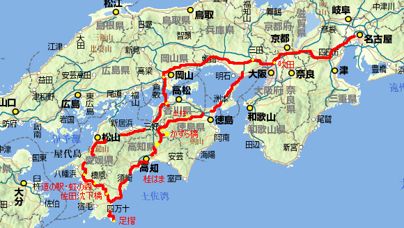 >足摺岬>なかむら>R56>須崎東IC>高知道>高知IC>はりまや橋>Pm6:30高知・土佐御苑870k?