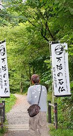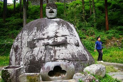 三度回ると願いが叶うそうなので、二人して回りました。 伝説>石の大鳥居を造る為にこの石仏を材料にしようとノミを入れたところ(そのノミは現存している) 傷口から血が出てきたため職人達は祟りをおそれた。その晩、上原山に良い石材があるという夢を見て、 その山に行き鳥居の石を探し、見つけることが出来た。職人達はその後石仏を刻み阿弥陀如来として祀った。 |