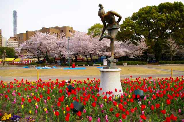 ![]() 踊り子像と満開のチューリップ、バックに桜も咲き誇る。 |