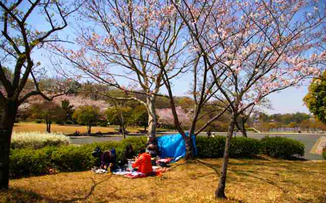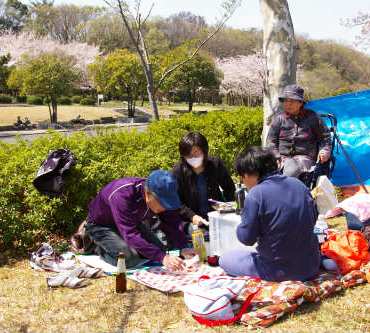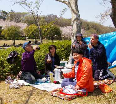 ![]() 風が冷たいので、ブルーシートで風防。猫ヶ洞池湖畔には枝垂れ桜が満開。 |