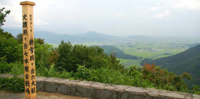 ![]() 木之本周辺を見下ろす。 奥のとがった山が小谷城址 織田信長が明智光秀に討たれ、賤ヶ岳の戦いは羽柴秀吉と柴田勝家の戦いである 織田勢力を二分する激しい戦いとなり、秀吉はこの戦いに勝利することによって織田信長の作り上げた 権力と体制の継承者となることを決定づけた。 |