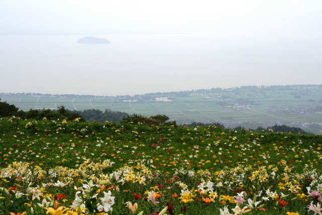 ![]() 琵琶湖に薄らと竹生島が見える Masami撮影 |