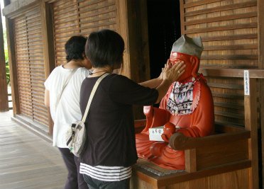 ![]() 「びんずる(賓頭廬)尊者」 お釈迦様の弟子、十六羅漢の一人で、神通力が大変強い。 「撫仏なでぼとけ」といわれ、病人が自らの患部と同じところを触れると、その神通力にあやかり治してもらえる? ふざけていると罰が当たるかも! |