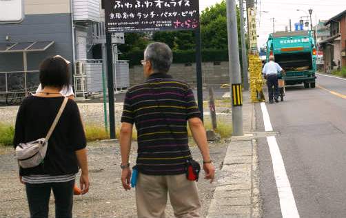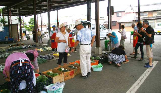 ![]() 青空市の場所を探していたら、手押し車で運ぶ人を見つけ後に従う。 |