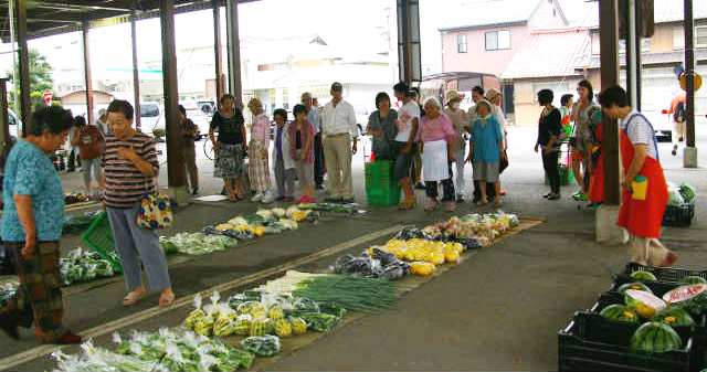 ![]() スイカよばれてから先ず下調べ! 近郊農家から集まってきて、ゴザの上に各自が育てた野菜、果物、花などを並べる。 |