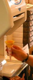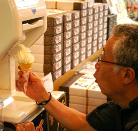 ![]() 手作りのソフトクリームを体験しました\300 中)私 クリームがコーンに乗っていれば成功! 右)Yasukoさん |