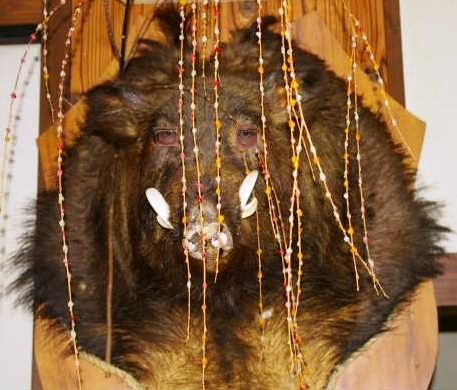 ![]() 剥製の特大猪133斤(80Kg?)』 鋭い眼光をしたイノシシ 学術名『オオシマイノシシ』 イノシシは通常50Kg〜60Kgある(猪の重さは斤で表す。1斤は600g) 足助町「井筒亀」より |