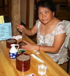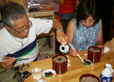 3段の一番上から薬味そばつゆをかけ、残った汁は2段目へ移す。そして3段目まで・・・美味しくいただく。
