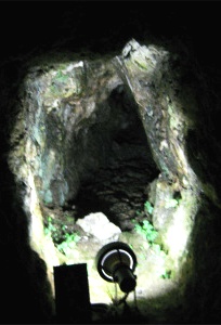 間歩の横穴↑ 「かなめ石」 この石の上で鉱石を砕いた 花を見つけてホットする