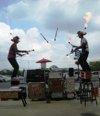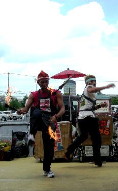 ![]() 炎天下でのファイアーショウに拍手 |
