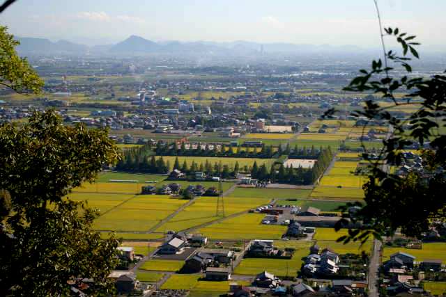 ![]() 左後方の尖がった山が金華山岐阜城だ。収穫を待つ黄金の穂が鮮やか! |
