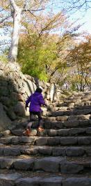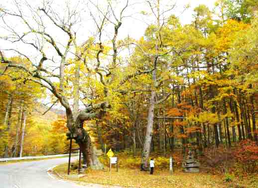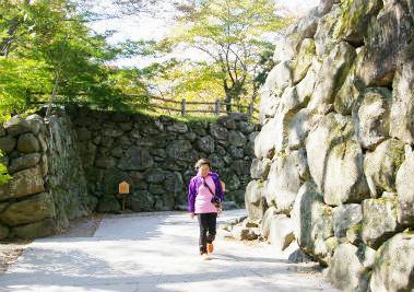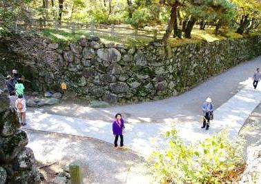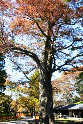 ![]() 二の丸跡から野ずら積みの石垣を眺める 「大ケヤキ」樹齢 500年・幹周り6.3m |