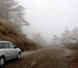 ![]() 池の平湿原を過ぎると道幅も狭まり、地道が霧の中へ消えていく・・・ |