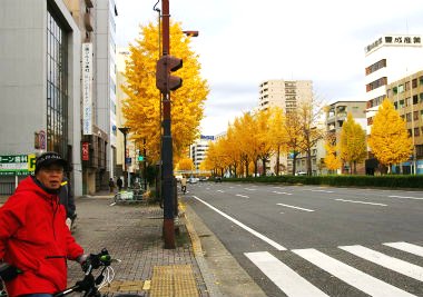![]() 8:30 千種駅に集合した理容婦人部の見送りを済ませ、Osima氏とイチョウ並木の桜通りを横断。 |