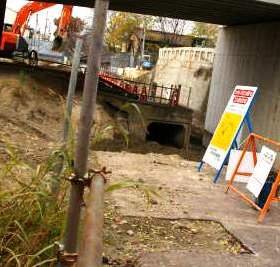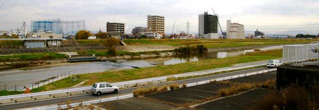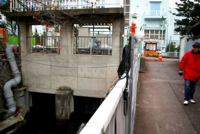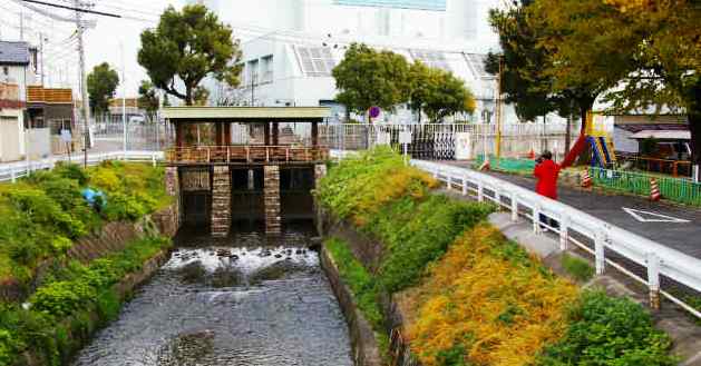 ![]() 庄内用水(樋門より上で分水)は三階橋新築と合わせて改修中でした(後ろがポンプ所) |