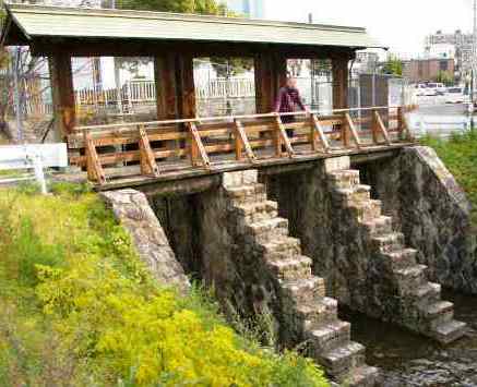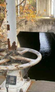 ![]() 3連の樋門に2つの石段があり、巻上機の上屋は木造で復元されています。 |
