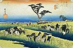 東海道五十三次 安藤広重の「首夏馬市」池鯉鮒(ちりゅう)宿の馬市・・・現在の知立市 知立神社の鎮座と盛大な馬市、木綿市が開催され、地方経済の要地になっていた。 |