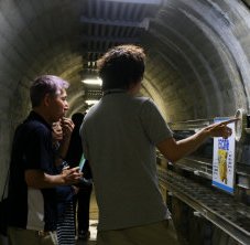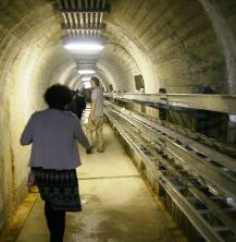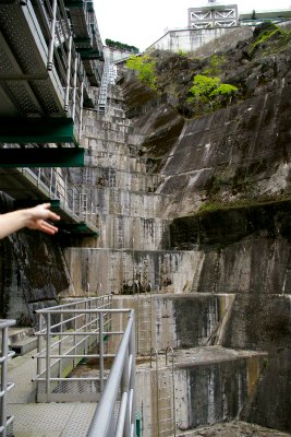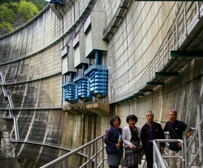 ![]() エレベーターで60m降りた。 コンクリートで固められた堤体内気温は年中15℃!探検気分! |