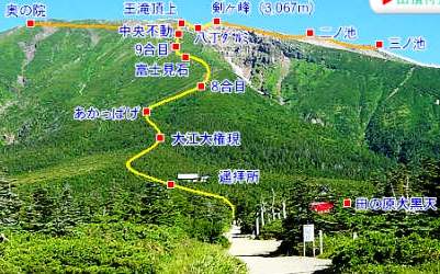 ![]() 登山道王滝口の起点、田の原は7合目2180m 田の原からの頂上剣ヶ峰3067mまで、距離にして3500m、標高差867m 田の原→八合目石室避難小屋→九合目石室避難小屋→王滝頂上山荘→八丁ダルミ→御嶽山 上り:4時間 45分 下り:2時間15分 往復7時間 23800歩でした |
