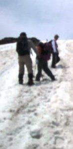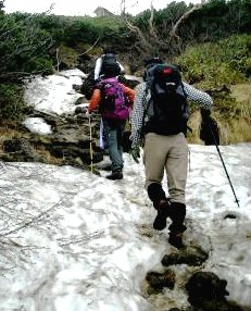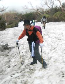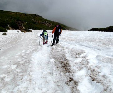 ![]() 雪渓で引き返してきた年配夫婦とすれ違う ストックを純ちゃんのと交換してもらったOsima氏 |