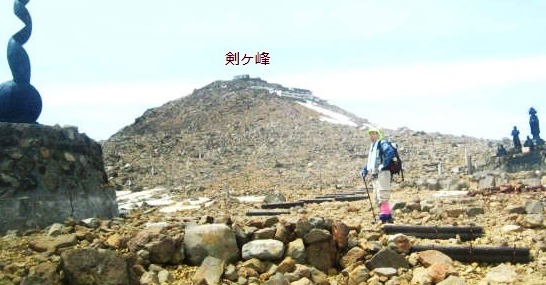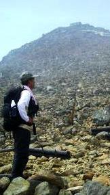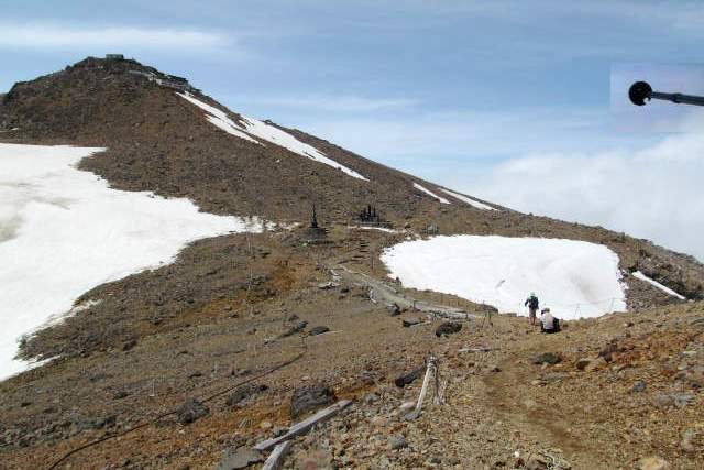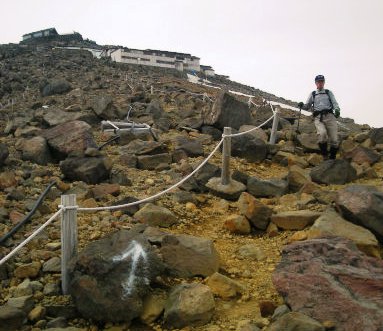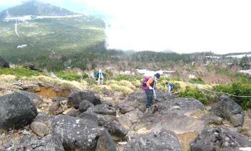 ![]() 雪が無くなり岩ばかりの急坂に息が上がる 登りの2本ストックは岩場では危ない? 8合目が↑ |