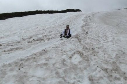 ![]() 初めはかかとで滑っていたが、足が攣ってきたのでお尻で滑ることに(濡れたが快調に下る) |