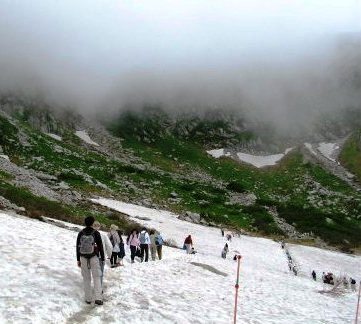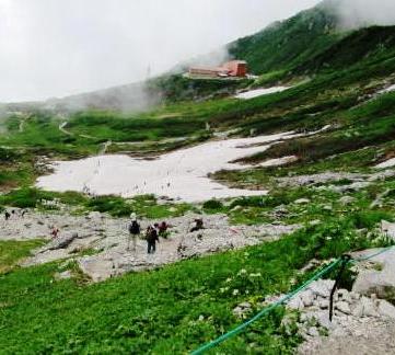 ![]() 今年はどの山も雪が多く、雪渓を横切っての登山開始。 八丁坂からロープウェー駅を見下ろす。 |