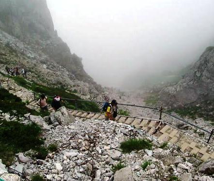 ![]() 急斜面を霧の中へ下る(右ひざが痛くなってきた) 12:45分(2時間15分)に合流して |