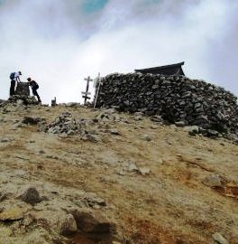 ![]() 1時間15分で駒ヶ岳登頂 右)三角点と駒ケ岳神社 |