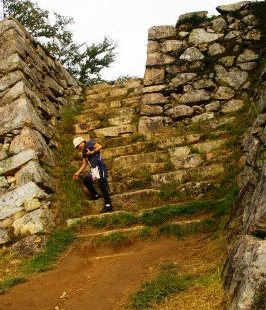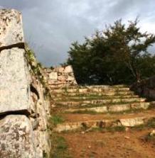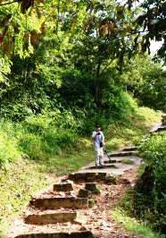 ![]() 左)本丸への虎口跡の急な段差の大きな階段を下りる。 これだけの石を運び上げたのは農民が多く駆り出されたんだろうね? |