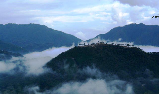 ![]() 立雲峡より竹田城跡 兵庫県朝来市(あさご) 天守台を中央に南千畳・北千畳・花屋敷が放射線状に配され、城が築かれている。 山全体が、虎が臥せているように見え「虎臥城(とらふすじょう・こがじょう)」とも呼ばれる。 |