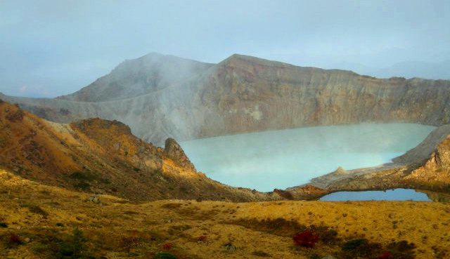 ![]() 白根山・湯釜(白い岩肌の火口壁にエメラルドグリーンの水) |