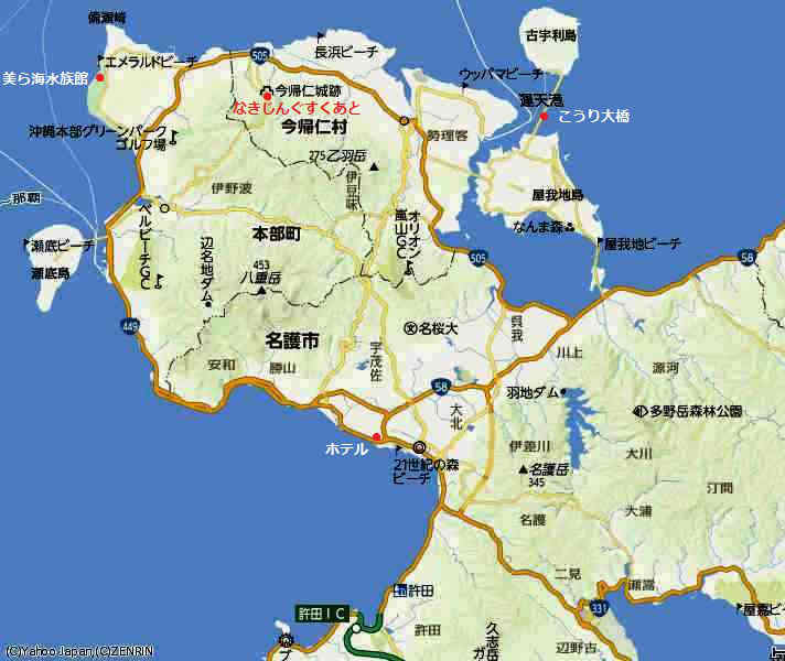 >R58>R449>県道114>美ら海水族館>今帰仁城跡>古宇利大橋>ホテル