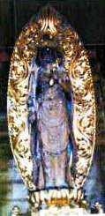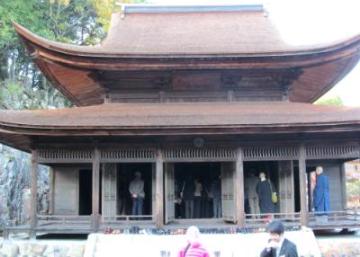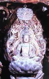 ![]() ![]() ![]() 国宝「観月堂」 須弥壇の上の岩窟式厨子聖観世音菩薩の坐像が本尊 団体客に特別公開中(右は薄暗くて見えなかったが、望遠でとらえた座像です) |
