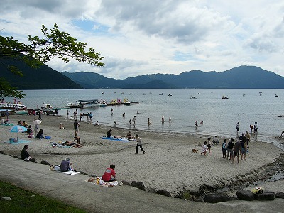 田沢湖は夏真っ盛りで湖水浴かな? 時間に追われて記念写真で「は〜い終わり〜」 |