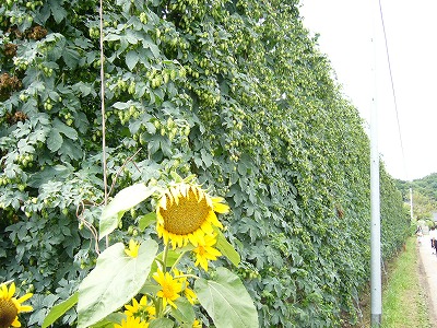 ビールの元になる「ホップの花」を初めて見る 「ひまわり」が暑さを増していた。こんばんは「ビールだー」