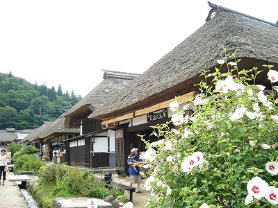【大内宿】 多くの茅葺家屋が並んでいて 「芙蓉の花」が目を楽しませてくれる |