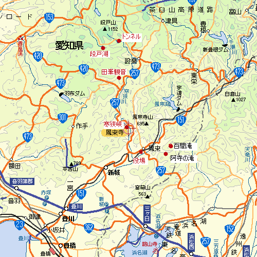 ![]() R257途中の寒狭峡に面白い滝がある(バイパスができたので旧道を走らないと見えない) 【鳳来町役場観光課】にて観光地図をもらう(昼食中で口をもぐもぐさせながらの説明でしたが、とても親切でした) |