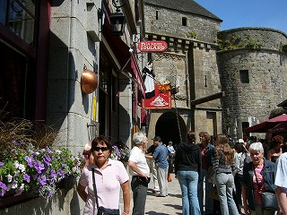![]() 「おむれつ」で有名な店の前で ← 奥に見える王の門は、扉を鎖でつった跳ね橋スタイルの この門は15世紀に完成したもの。 ちなみに門の上部には現在モン・サン・ミッシェル市役所がある。 |