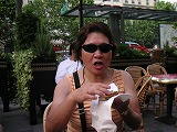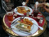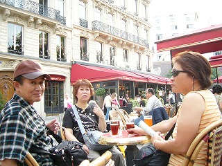サンゼリア通凱旋門に近い【フーケ】で辛うじて注文 注文は、フランス語でメモしたの見せたら、出来ません! おいおい、どないするんじゃ?嫁さんが本の挿絵指差したらOK 本に指が一番早い注文のしかたでした。 高いサンドウイッチとドリンクだったわ。 後で分かった事:外のテーブルは高いだってー! 見た目は悪いが味は良い フランスに来てオープンカフェが憧れでした。 |