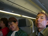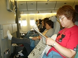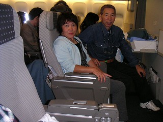 機内の座席は一番前列でベビーベットが出せるシートが広い、 Tさんの娘さんの友達がJLカウンター受付係りなの〜やったね! 12時間は楽しく短く感じられた(ビデオにゲーム)。 |